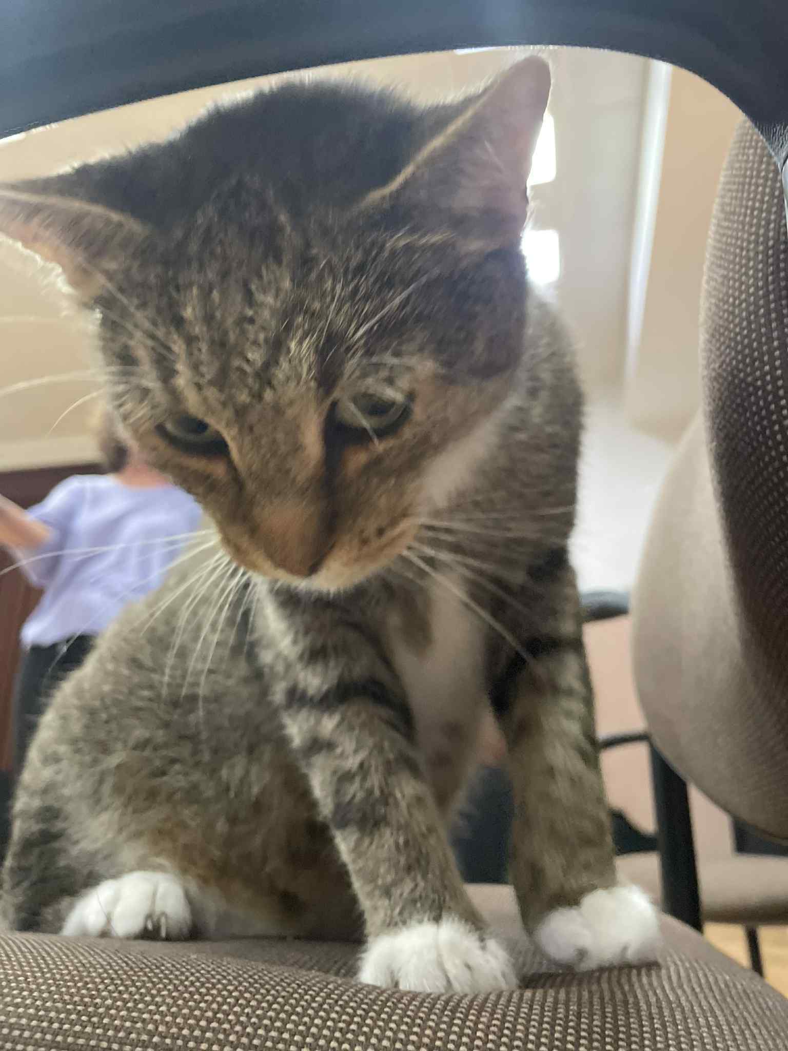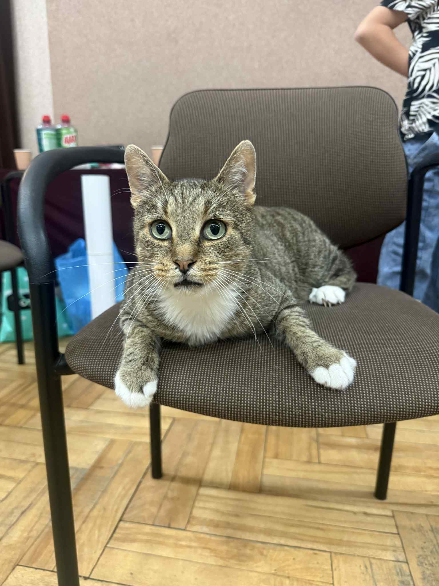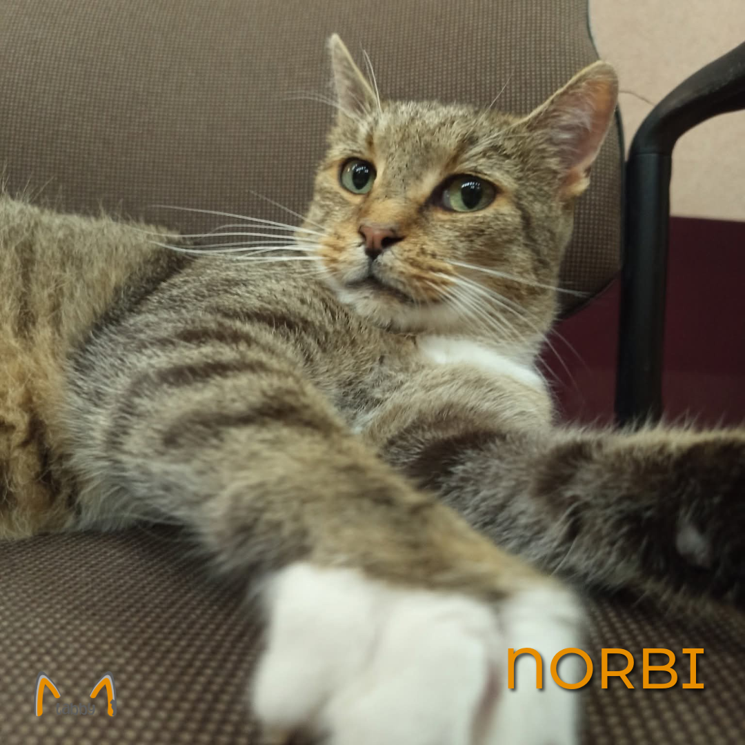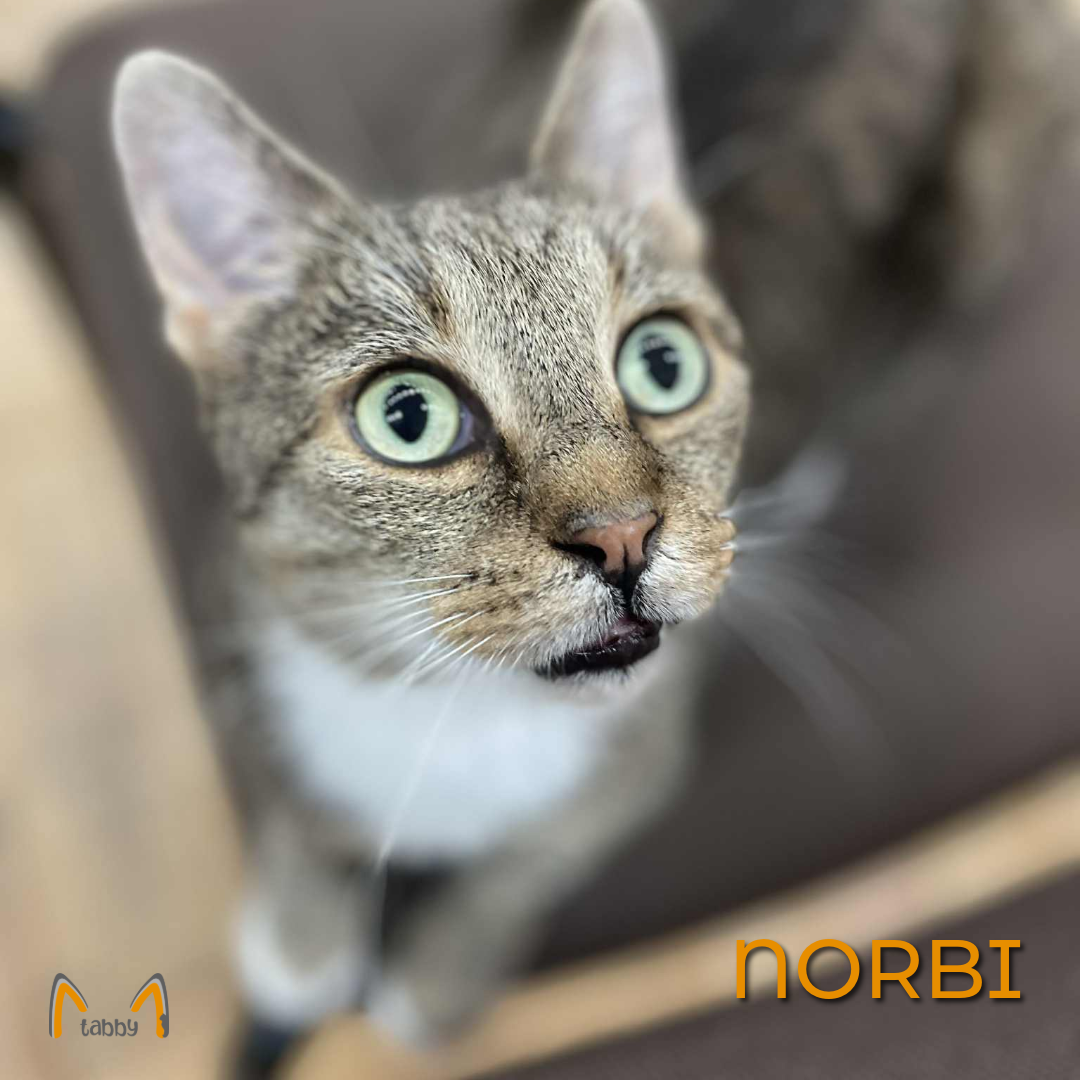 Norbi to piękny, pręgowany kocur o hipnotyzujących zielonych oczach i uroczej białej „skarpetce” i „śliniaczku”.